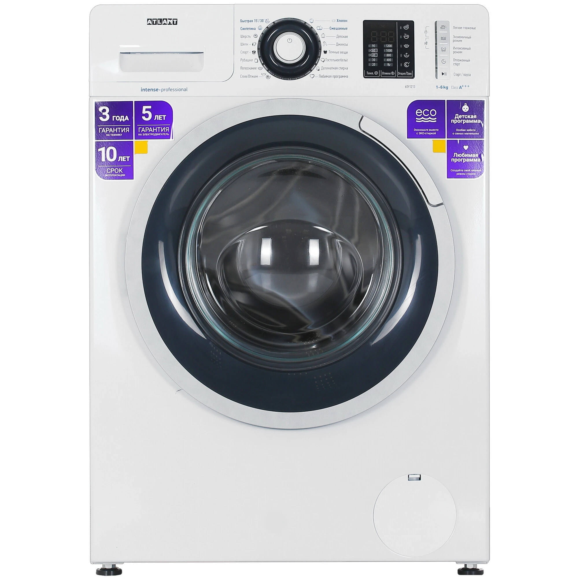Стиральная машина ATLANT СМА 60У1213-01 с фронтальной загрузкой и полипропиленовым баком вмещает 6 кг белья. Поворотный механизм помогает выбирать 1 из 16 программ, сенсорные кнопки отвечают за дополнительные функции. Дисплей и яркие индикаторы показывают время до конца цикла, этапы программы, выбранную температуру и скорость отжима. Вы можете настраивать таймер отсрочки до 24 ч, отключать звуковой сигнал и блокировать панель управления.