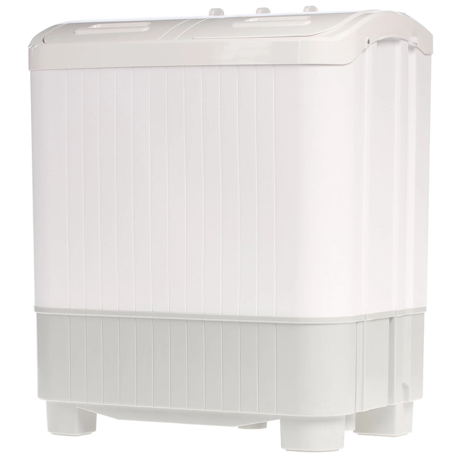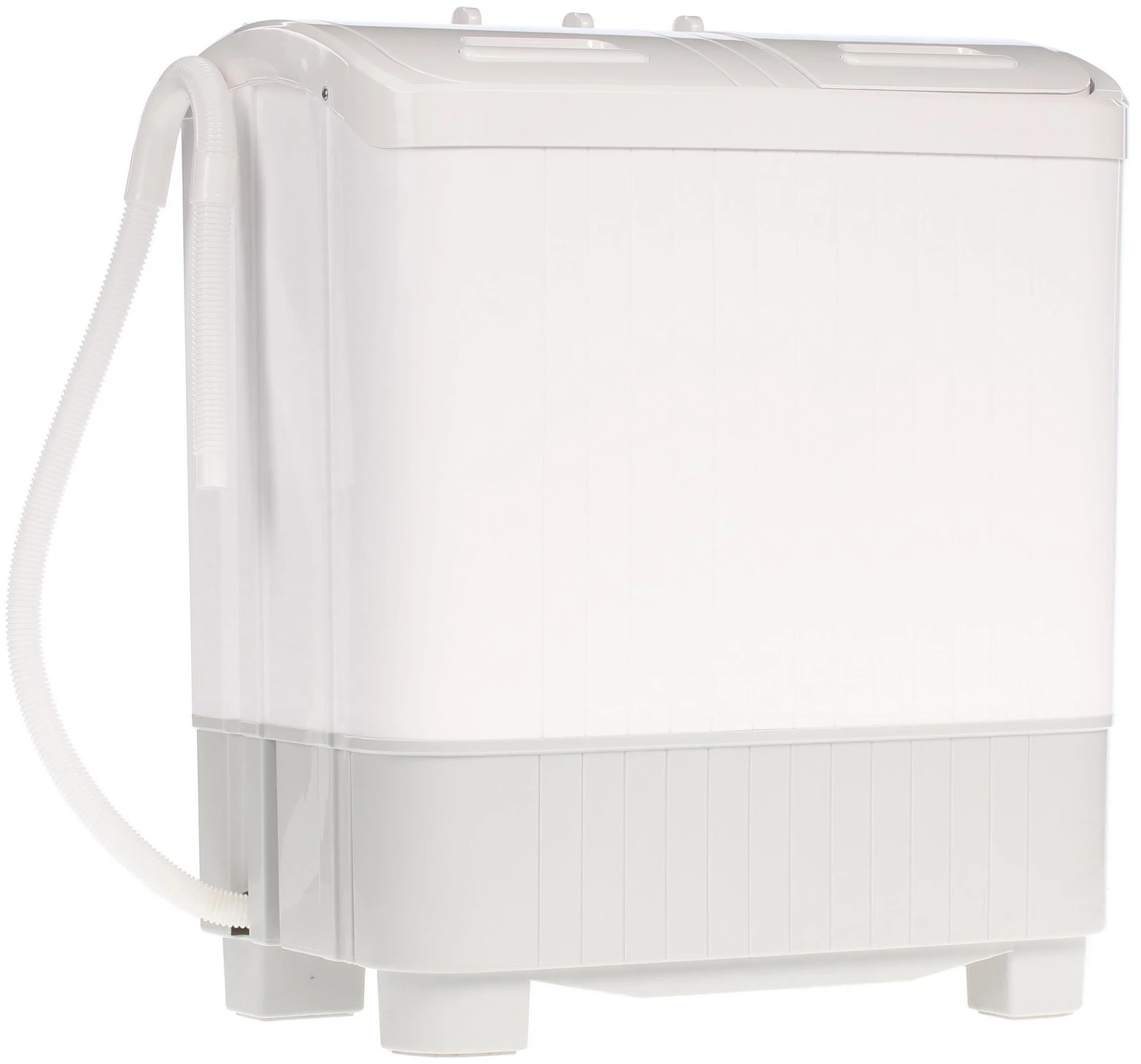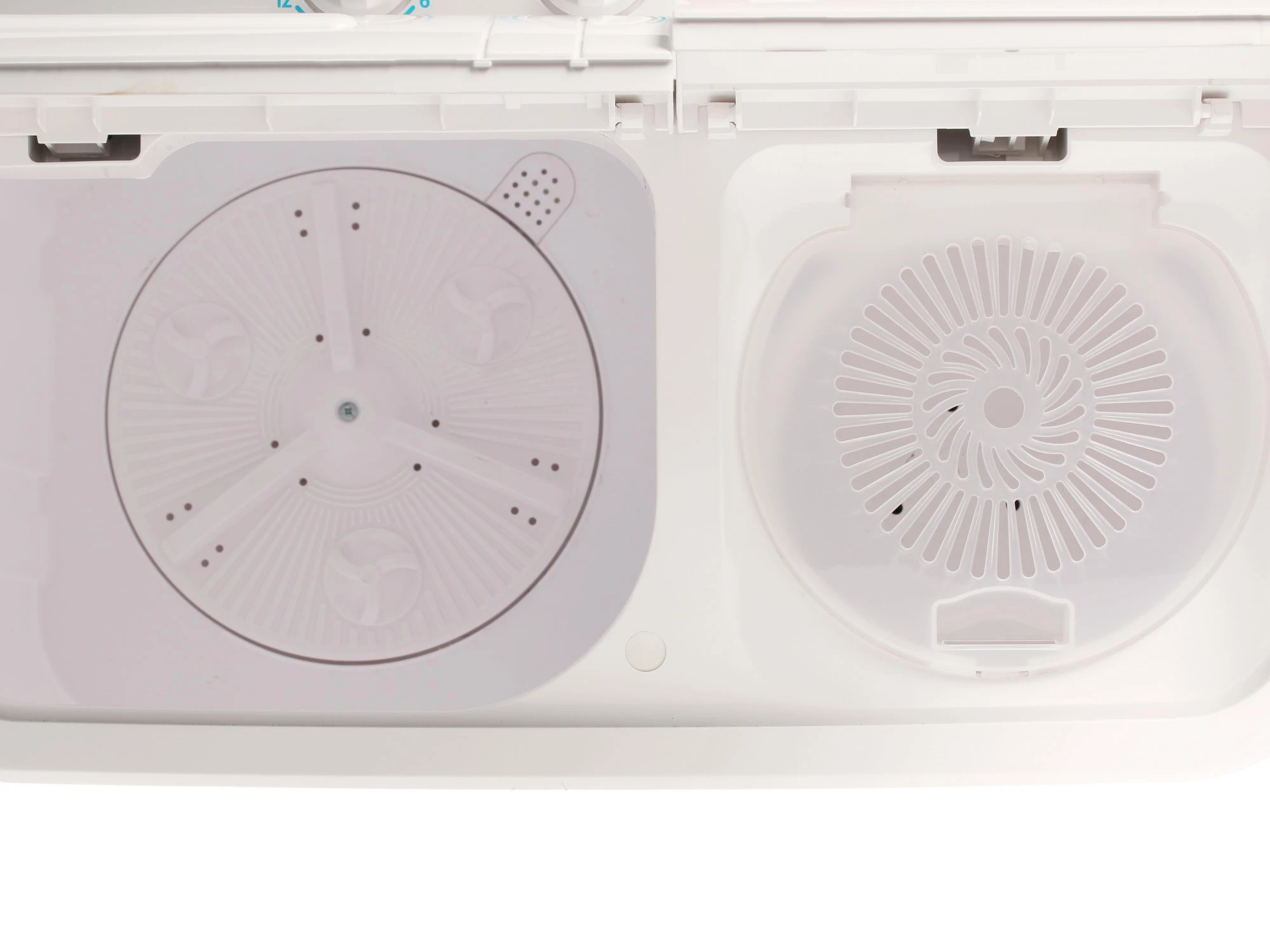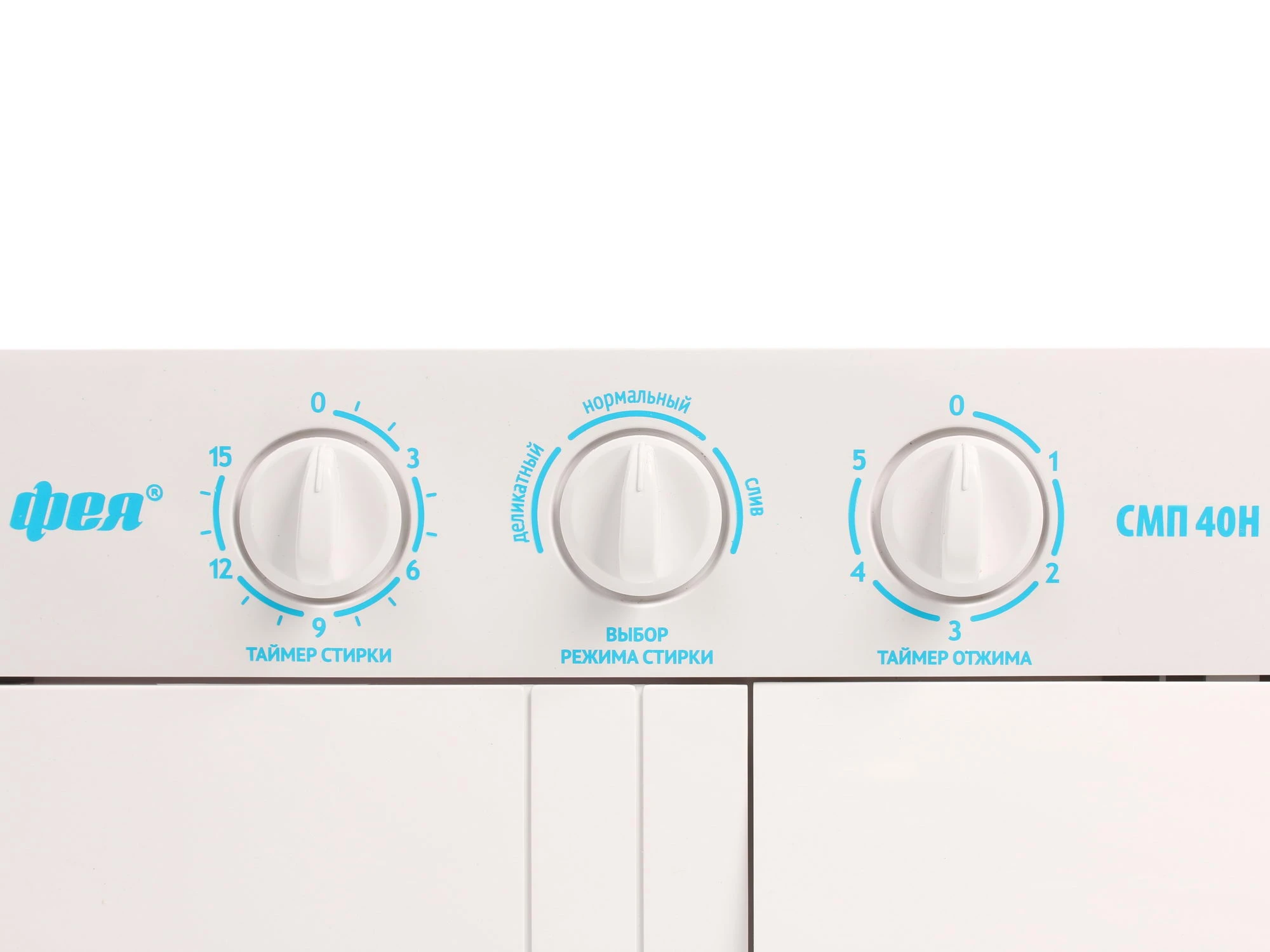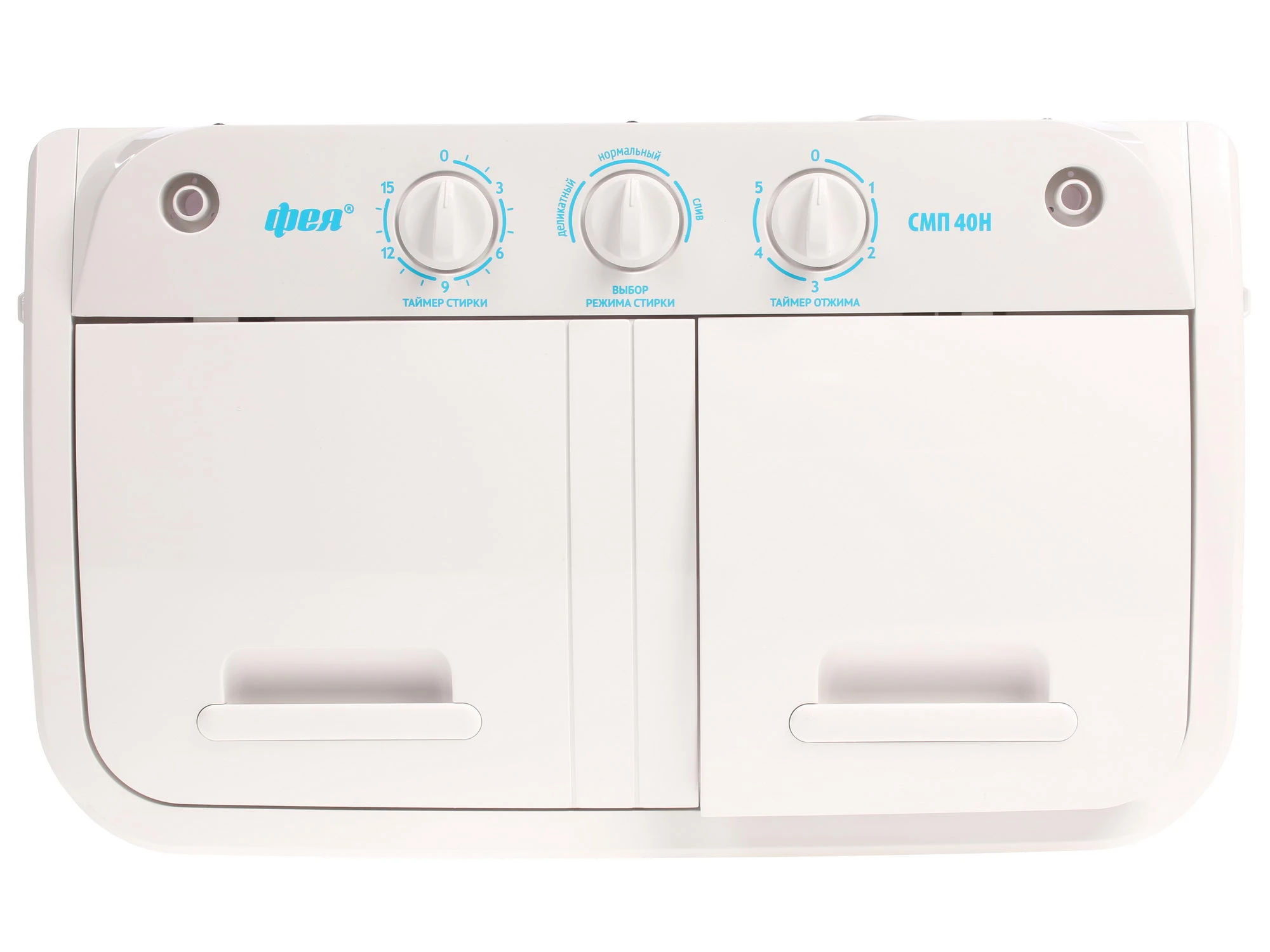 Верхняя часть корпуса оборудована механической панелью управления. Три регулятора позволяют установить время стирки и отжима, а также выбрать режим очищения вещей. Программ всего две. Одна из них рассчитана на неприхотливые ткани, вторая предназначена для вещей, которые нуждаются в деликатном подходе. Также, сверху имеются две откидные крышки, которые ведут в стиральный и отжимной бак. Эргономичные ручки позволяют плотно закрывать отсеки. За счет низкого уровня пенообразования допускается использование любого стирального порошка.