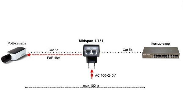 PoE-инжектор. Мощность PoE - до 15.4W. Напряжение PoE - 48V(конт. 4,5 (+), 7,8 (-)), Fast Ethernet. Совместим с оборудованием PoE IEEE 802.3af. Порты: вх. - RJ45(FE, 10/100 Base-T), вых. - RJ45(PoE). Питание: AC100-240V.
