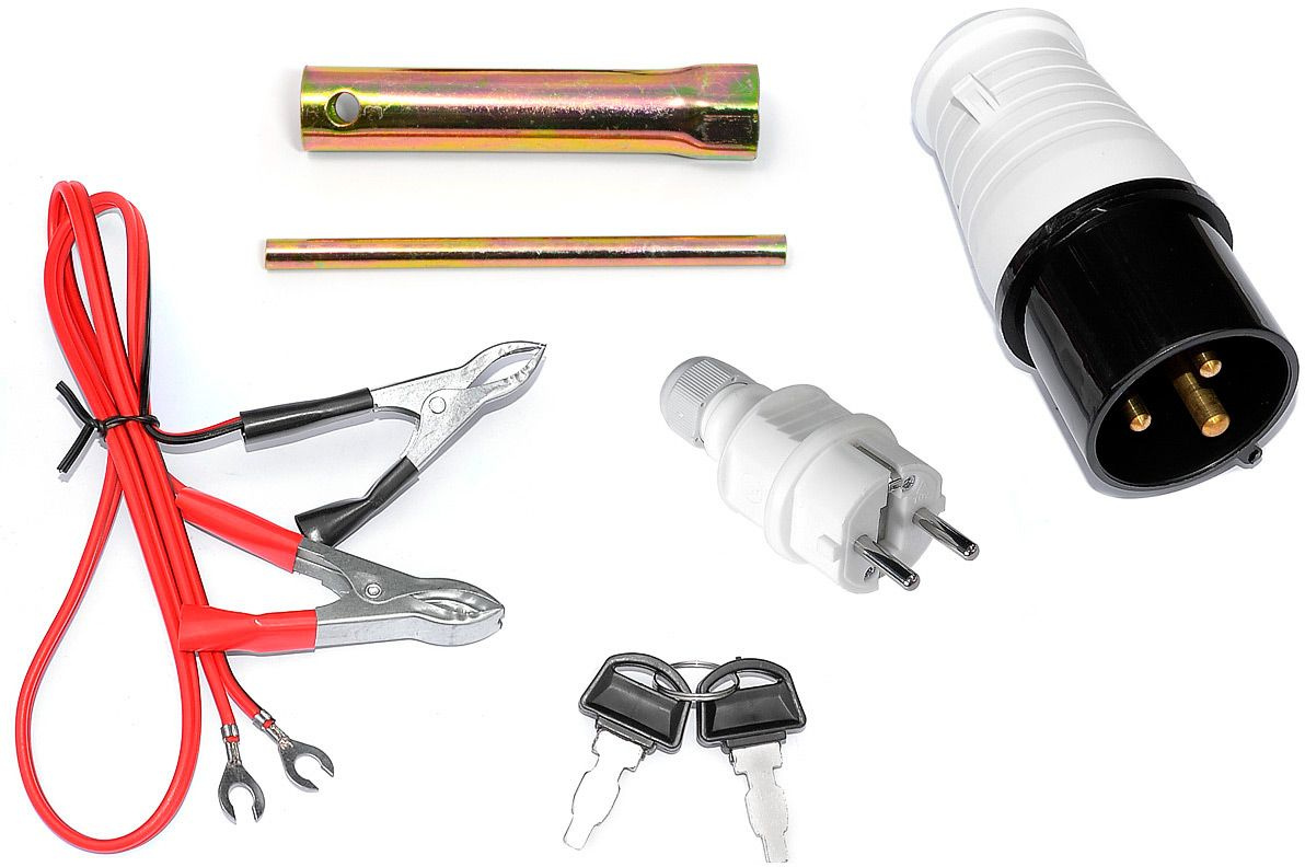 Генератор, аккумулятор, вилка 230В/16А - 1 шт, вилка 230В/32А - 1 шт, документация, клеммы для зарядки аккумулятора, ключи зажигания, ключ свечной.