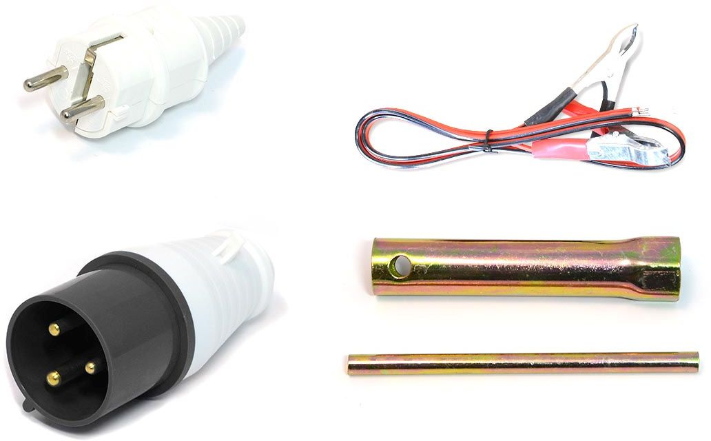 Генератор, аккумулятор, вилка 230В/16А, вилка 230В/32А, документация, клеммы для зарядки аккумулятора, ключ свечной, транспортировочный комплект.