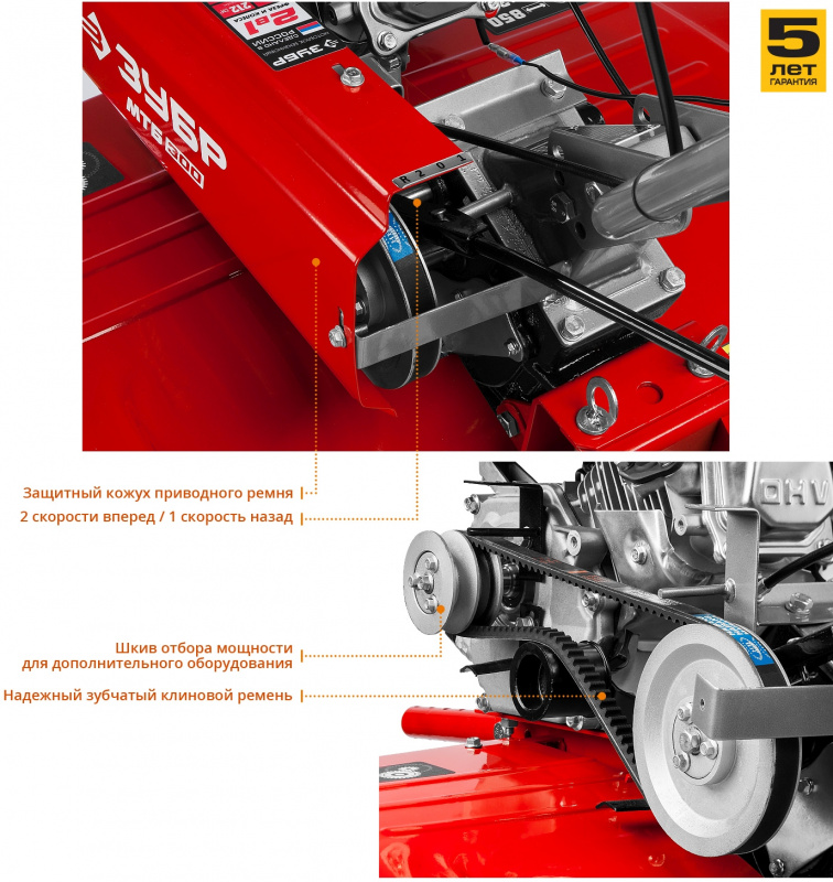 • Клиновидный зубчатый ремень в приводе культиватора обладает повышенной износостойкостью по сравнению с обычными ремнями.