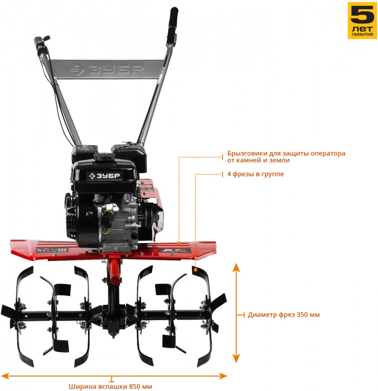 Мотоблок бензиновый ЗУБР МТБ-300 - это надежный и маневренных агрегат, предназначенный для рыхления и культивации почвы на дачном участке площадью 1500-2000 м^2. Мотоблоки производителя ЗУБР созданы с заботой о пользователях: дополнительный комфорт использования обеспечивает регулируемая по вертикали рукоять, а так же на корпусе предусмотрен щиток, защищающий пользователя от попадания земли.