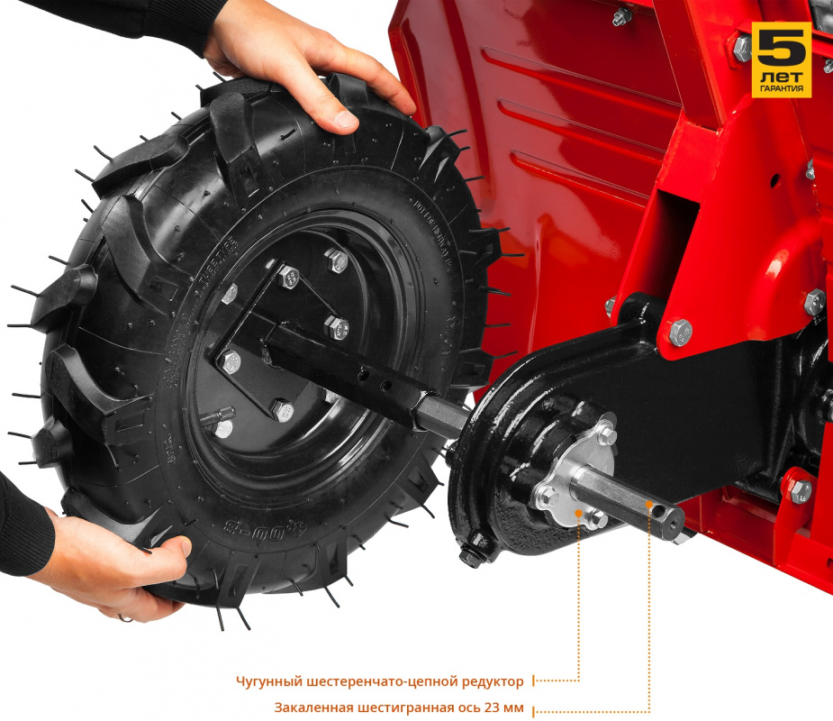 • Чугунный шестеренчато-цепной редуктор с закаленной шестигранной осью 23 мм.