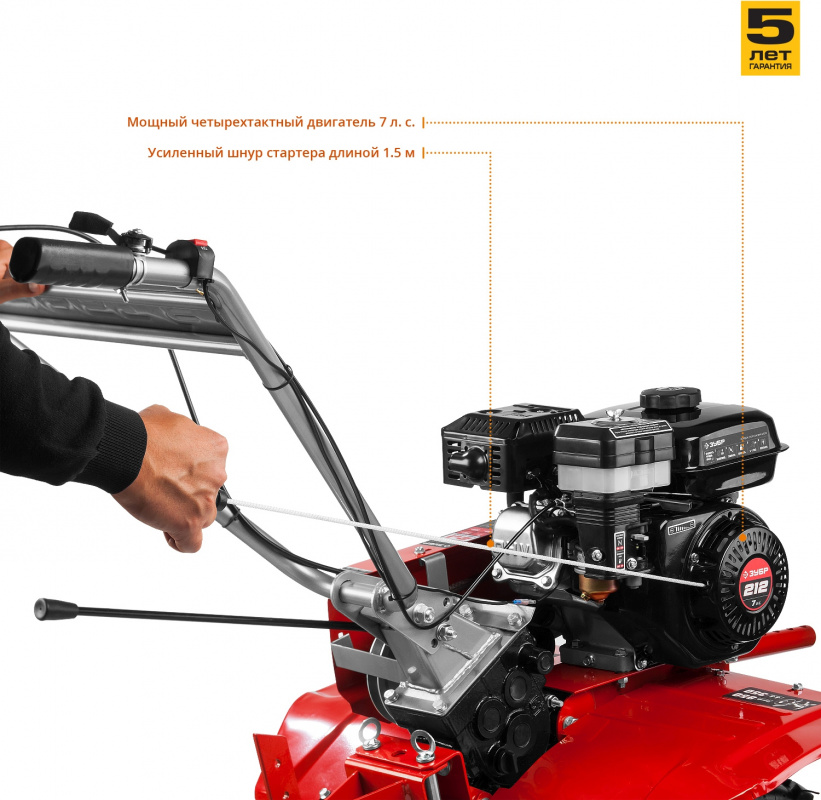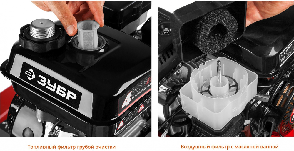 • Мощный четырехтактный двигатель с воздушным фильтром в масляной ванне увеличивает моторесурс.